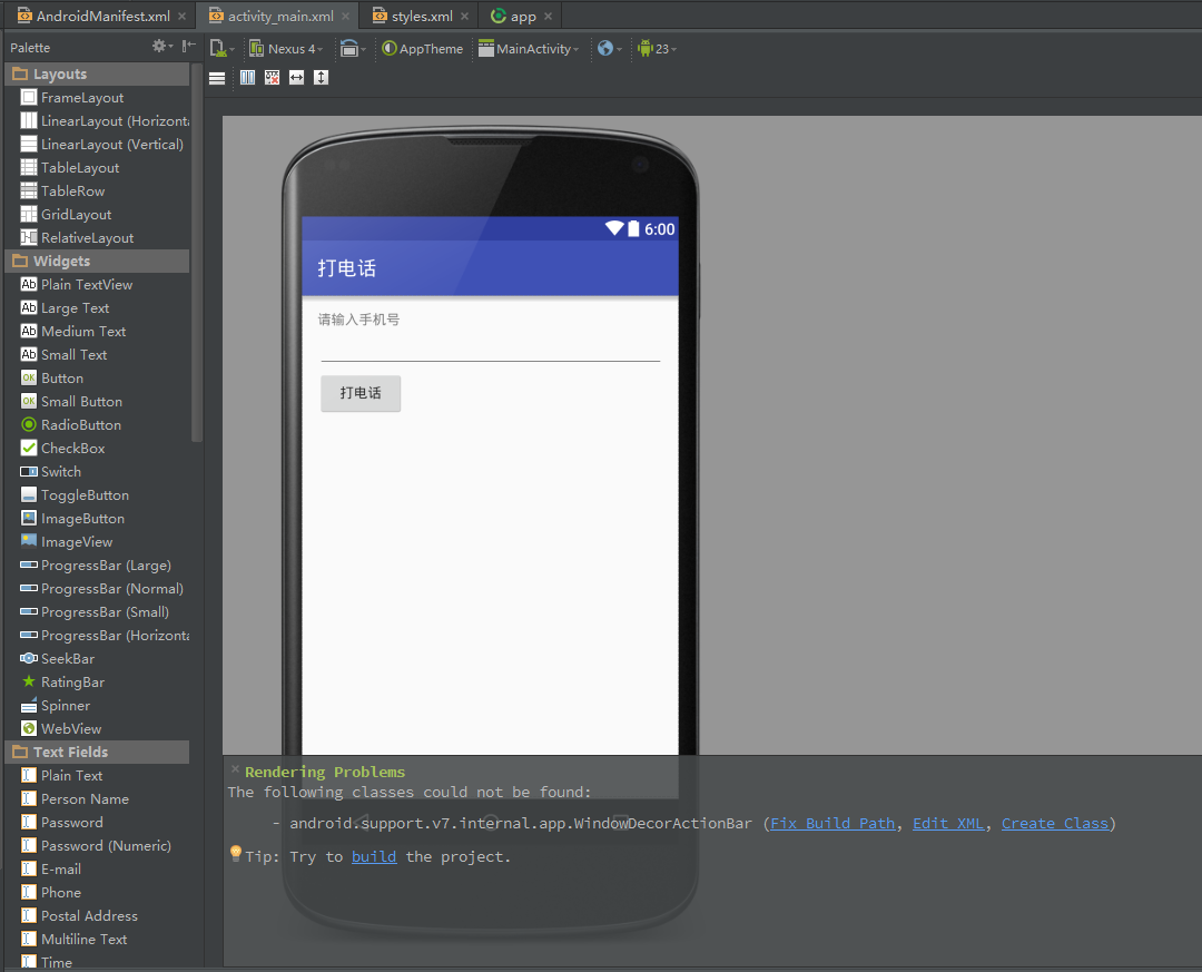 styles.xml 文件中 Theme.AppCompat.Light.DarkActionBar 前添加Base.