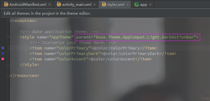 <style name="AppTheme" parent="Base.Theme.AppCompat.Light.DarkActionBar">