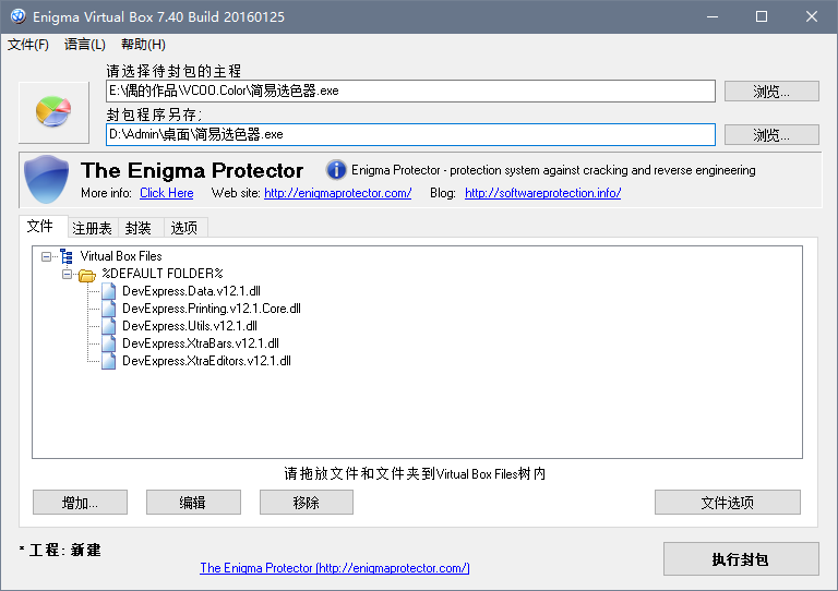 Enigma Virtual Box是一款简单易用的单文件软件制作工具,该软件制作的单文件不会像有些软件制作的单文件那样需要释放到临时文件夹才能运行,Enigma Virtual Box制作的单文件完全只在内存中运行,十分方便。