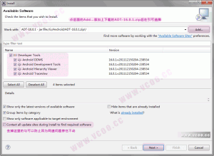 3、确定返回,在work with后的下拉列表中选择我们刚才添加的site,然后我们会看到下面出现Developer Tools,展开它会有Android DDMS和Android Development Tool,勾选他们,然后把“Contact all update sites during install to find required software”前面的勾去掉,然后next(以后你懂的),安装完成后重启Eclipse就OK了。