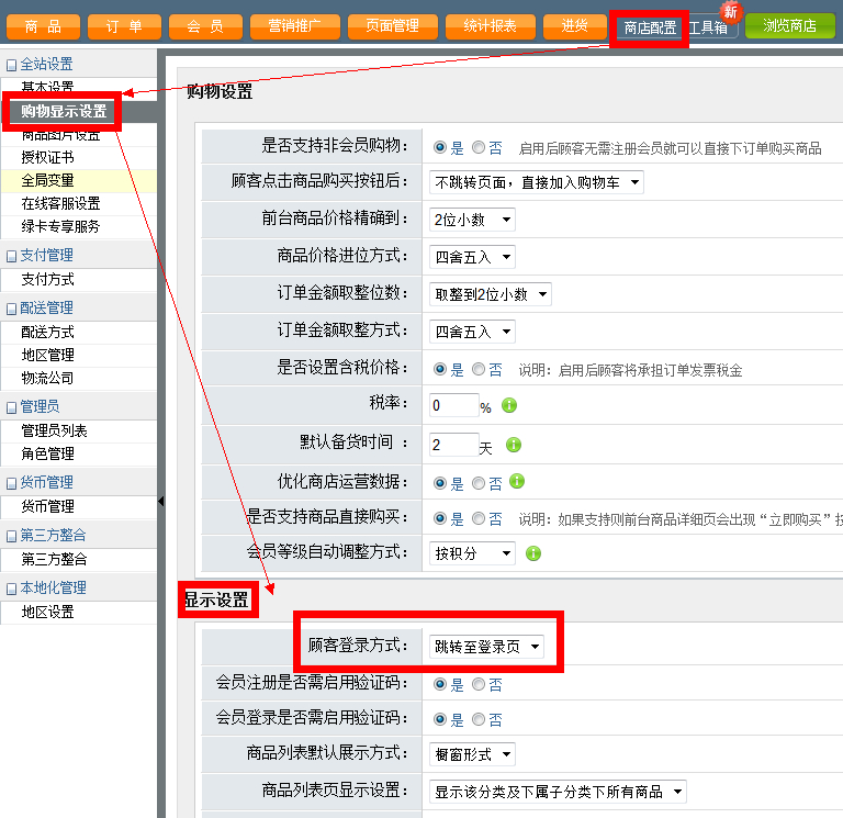 (1)登录ShopEX后台,在购物设置中设置登录方式为“跳转至登录页”的方式;