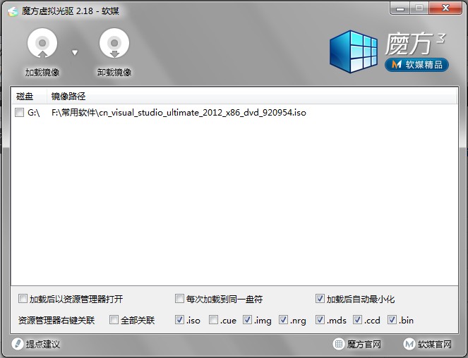 平时装一些大的软件一般是ISO格式的安装程序,一般需要解压或刻盘来安装,这时候用虚拟光驱就比较方便了,选了几种试了下发现魔方虚拟光驱最好用,绿色小巧,软媒旗下作品,推荐一下。