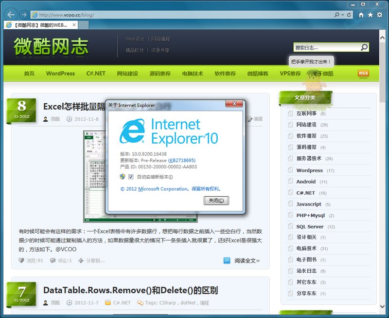 系统要求是Win7 SP1 32位/64位操作系统,Win7版IE10浏览器预发布版的具体版本号是10.0.9200.16438。