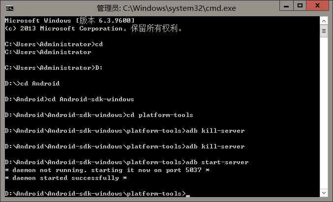 4.再输入 adb start-server 如果不成功会提示 daemon not running. starting it now on port ***的