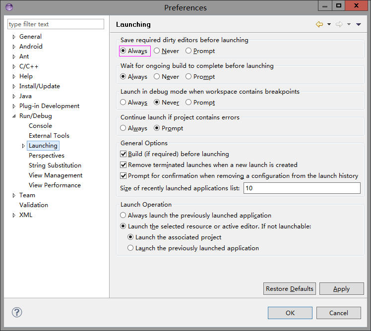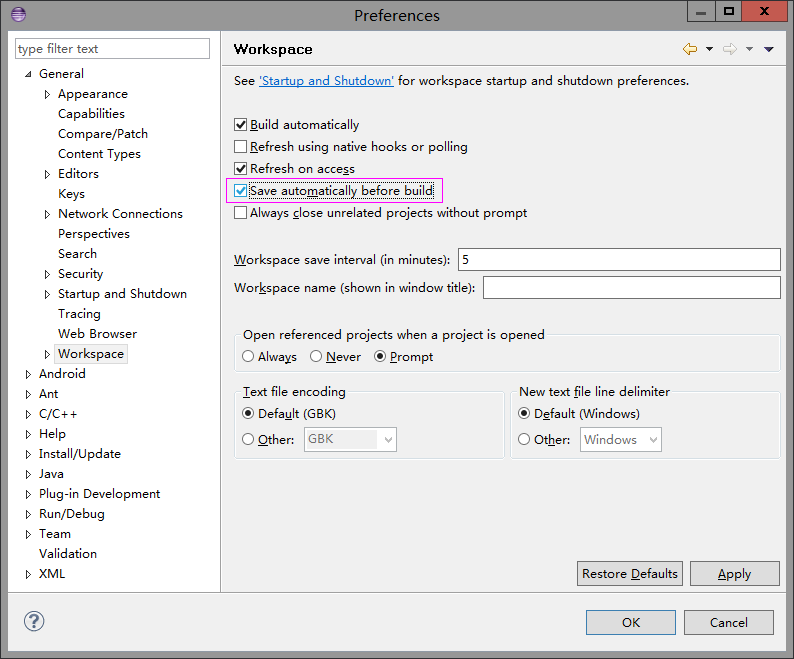 Eclipse在编译运行项目之前自动保存修改的文件: